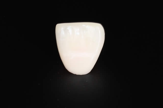 最先端の3D光学カメラで撮影、デザインしセラミックのブロックを機械で削り出した被せ物です。金属アレルギーの心配はありません。